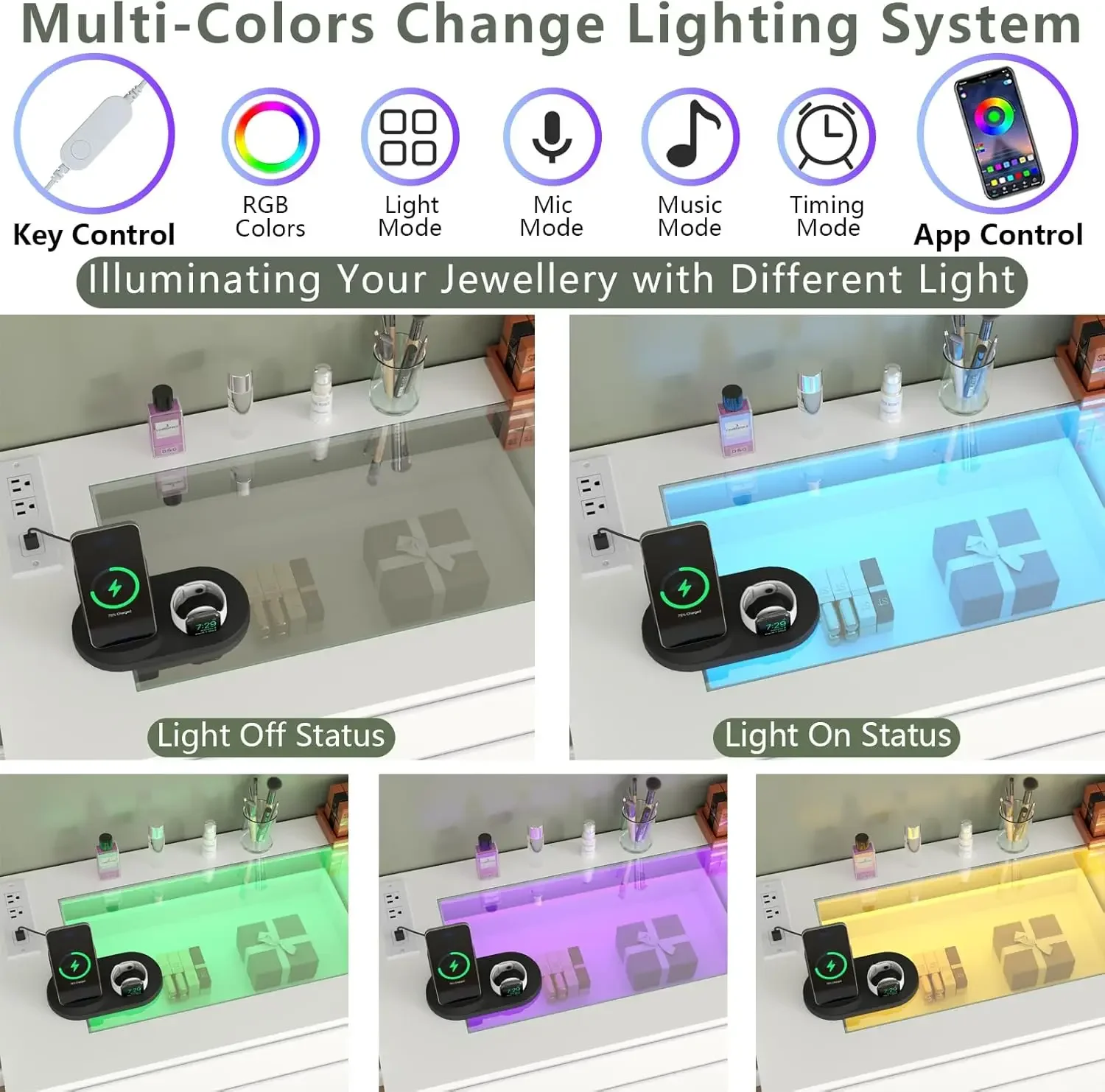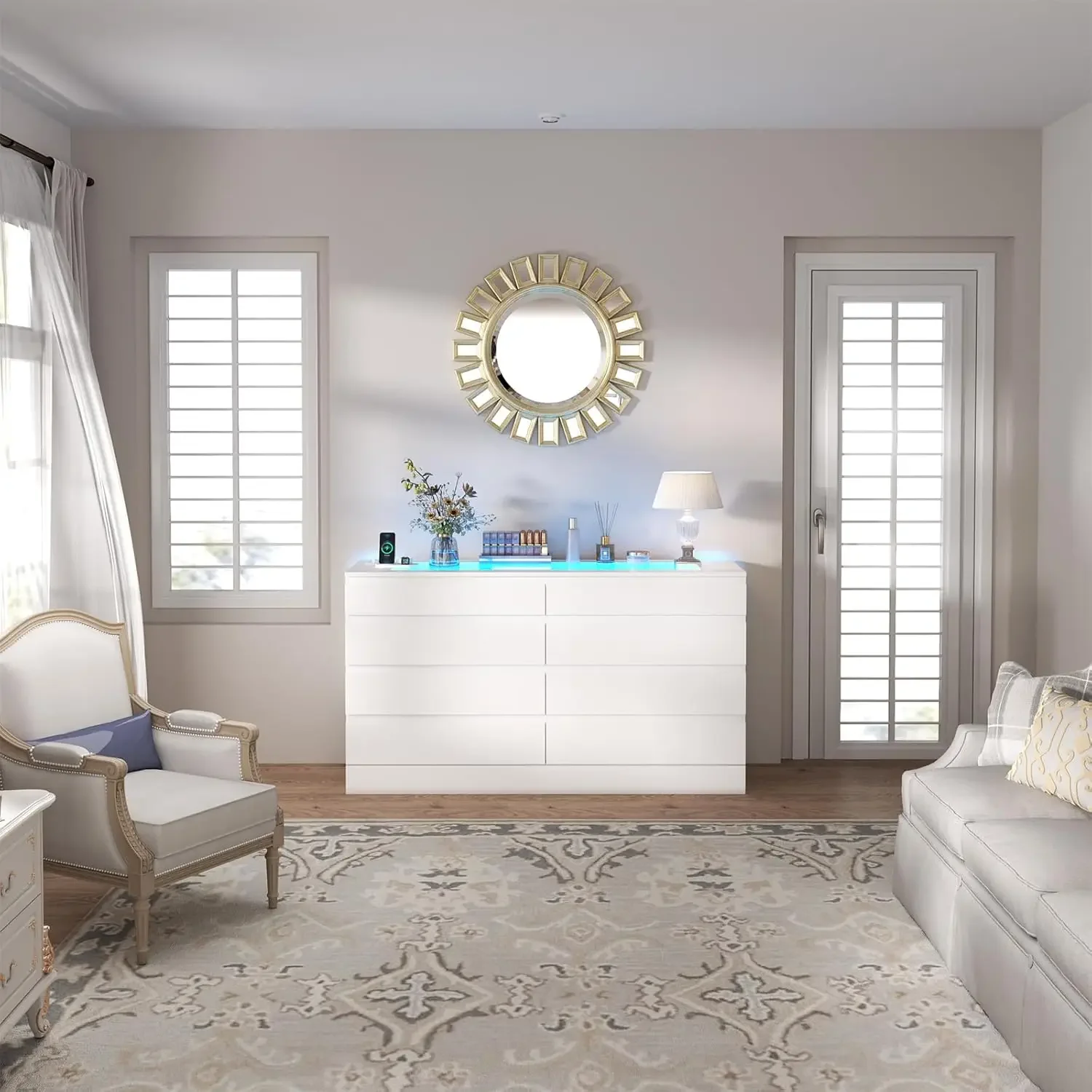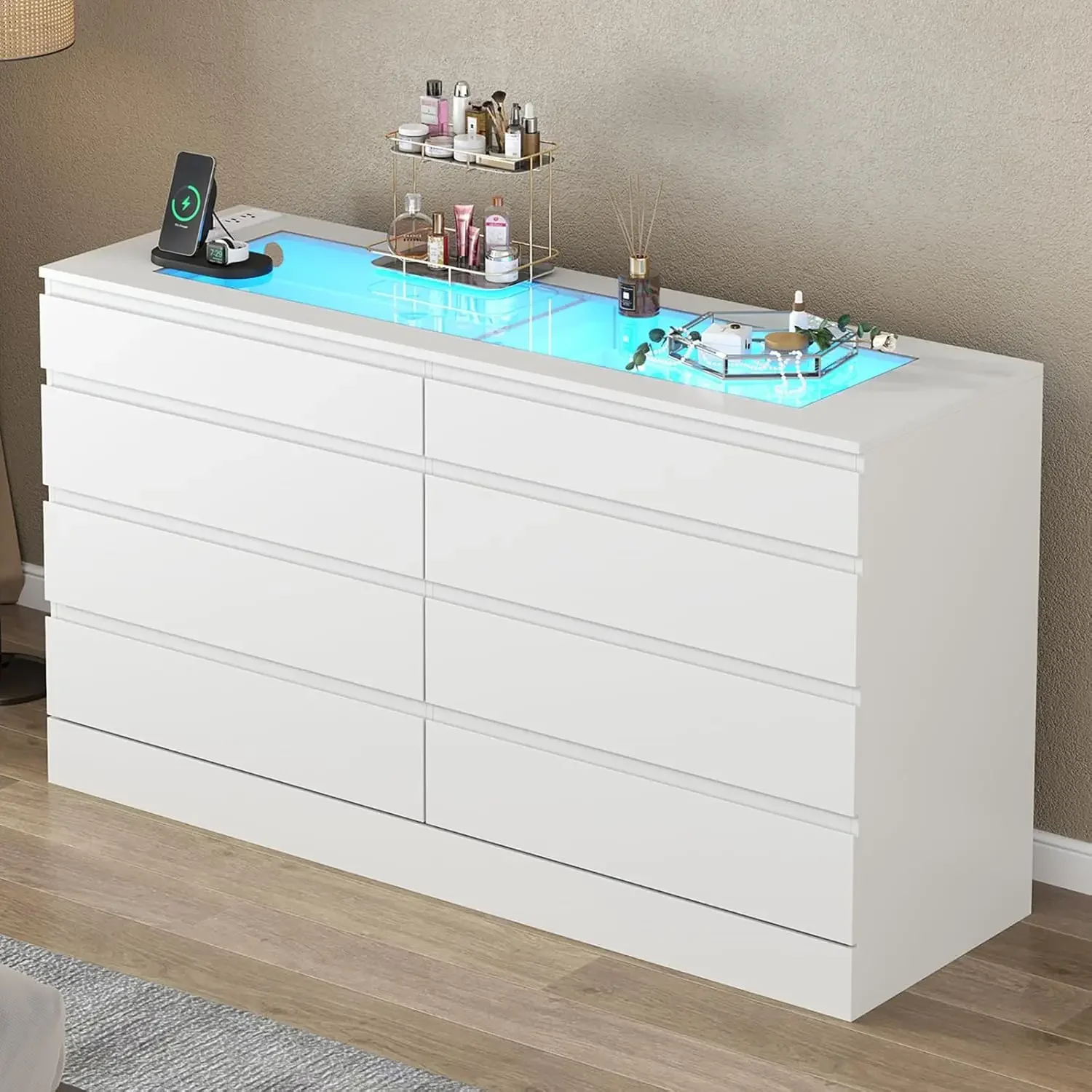 [No More Clutter with 8 Drawers] Drawer dresser from Gyfimoie with 8 storage drawers provides exceptional space to keep your room clutter-free and items neatly organized. With multiple drawers, you can categorize and separate your belongings from your bulky winter sweaters to your delicate summer linens. Making it easier to find what you need quickly. [Innovative Glass Top with LED Light] The top of white dresser is tempered glass, which provides a smooth, reflective surface that can be used to display decorative also pretty visibility. Combine with LED light in the first level drawer, which makes it more convenient for you to display and access your jewellery or makeup collection. Making the dresser a standout piece in any room. [Drawer Dresser Integrated Power Outlet] Experience the perfect fusion of style and modern convenience with our LED dresser, now upgraded with a built-in charging station. Whether it’s your smartphone, tablet, or smartwatch, you can keep them charged and ready to go. This practical enhancement transforms the white drawer dresser from a mere storage solution into a hub of organization and connectivity. [Blends Well with Any Interior Style] In essence, this 8-drawer dresser is a chameleon of interior design. Its neutral color palette boosts its flexibility, allowing it to seamlessly integrate with numerous color schemes. The led dresser’s sleek lines and balanced proportions enhance your existing decor without overshadowing it, adding a harmonious touch to your room. Its timeless and eclectic charm ensures it fits beautifully in any space. [Reliable Construction for Long Lasting] Crafted with meticulous attention to detail, this 8 drawer dresser features a sturdy and durable tempered glass top that exudes a sense of luxury. Its high-quality premium MDF boards and reinforced with heavy-duty steel hardware and smooth-gliding drawer rails ensures long-lasting durability, allowing you to enjoy its beauty and functionality for years to come. [Hassle-free Purchase & Assemble] The white dresser is designed comes with clear and detailed instructions that guide you through the installation process step by step. Most components are pre-drilled and ready for easy attachment, allowing you to quickly and effortlessly put the cabinet together, saving you time and effort while setting up your comfortable storage space.